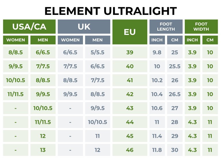 Element Ultralight Size Guide